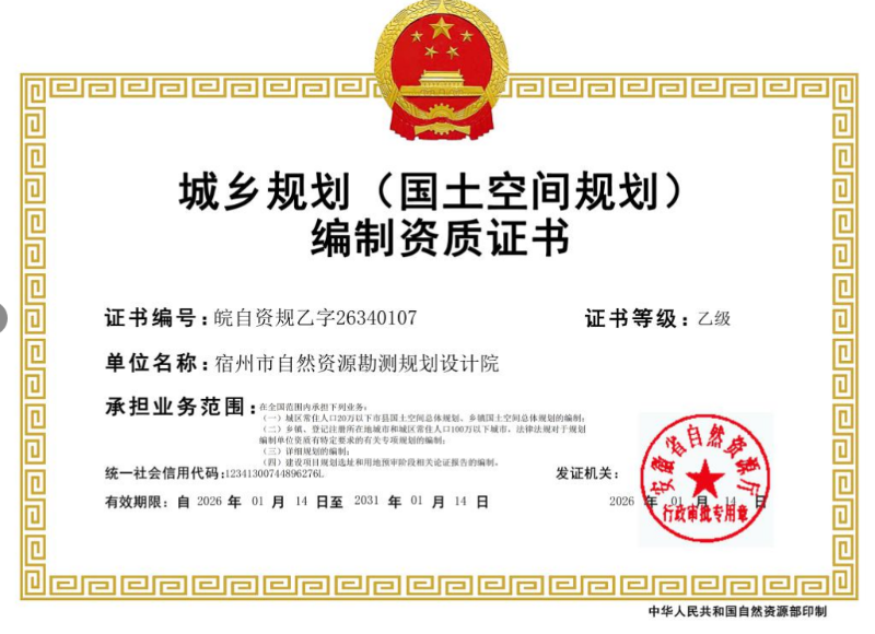 我院申报的城乡规划(国土空间规划)资质获得省自然资源厅批准(皖自资规乙字26340107),为全市“首个”获批资质单位。对照国土空间规划领域新形势、新需求,我院在队伍建设、技术升级、业务拓展等方面提前谋划,立足“支撑单位、事业单位、技术单位和服务单位”四个基本定位,不断加强人才建设,拓展业务服务能力,紧跟国土空间规划行业改革步伐。