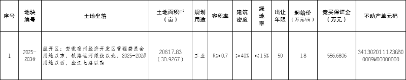 2025-203#地块要求:1、竞买人须为公司法人。2、依据安徽宿州经济开发区管理委员会函,该宗地为“标准地”出让;产业类型属化学原料和化学制品制造业项目;《工业项目用地投入产出监管合同》约定固定资产投资强度不少于200万元/亩,亩均税收不低于15万元/年,其他具体指标要求详见《工业项目用地投入产出监管合同》。此条款由安徽宿州经济开发区管理委员会及税务部门负责监督落实。3、竞得人在签订该宗地《成交确认书》后30日内与安徽宿州经济开发区管理委员会签订《工业项目用地投入产出监管合同》(详见挂牌文件)。4、出让合同签订之日起1个月内缴清全部土地出让金。5、竞得人须自合同签订之日起1年内开工,并在开工后2年内竣工。6、自签订出让合同之日起7日内由安徽宿州经济开发区管理委员会办理土地移交手续,并负责监督受让方将合同条款履行到位。宗地范围内场地平整达到无建筑物、构筑物,周围基础设施达到水、电、路、气以现状为准。